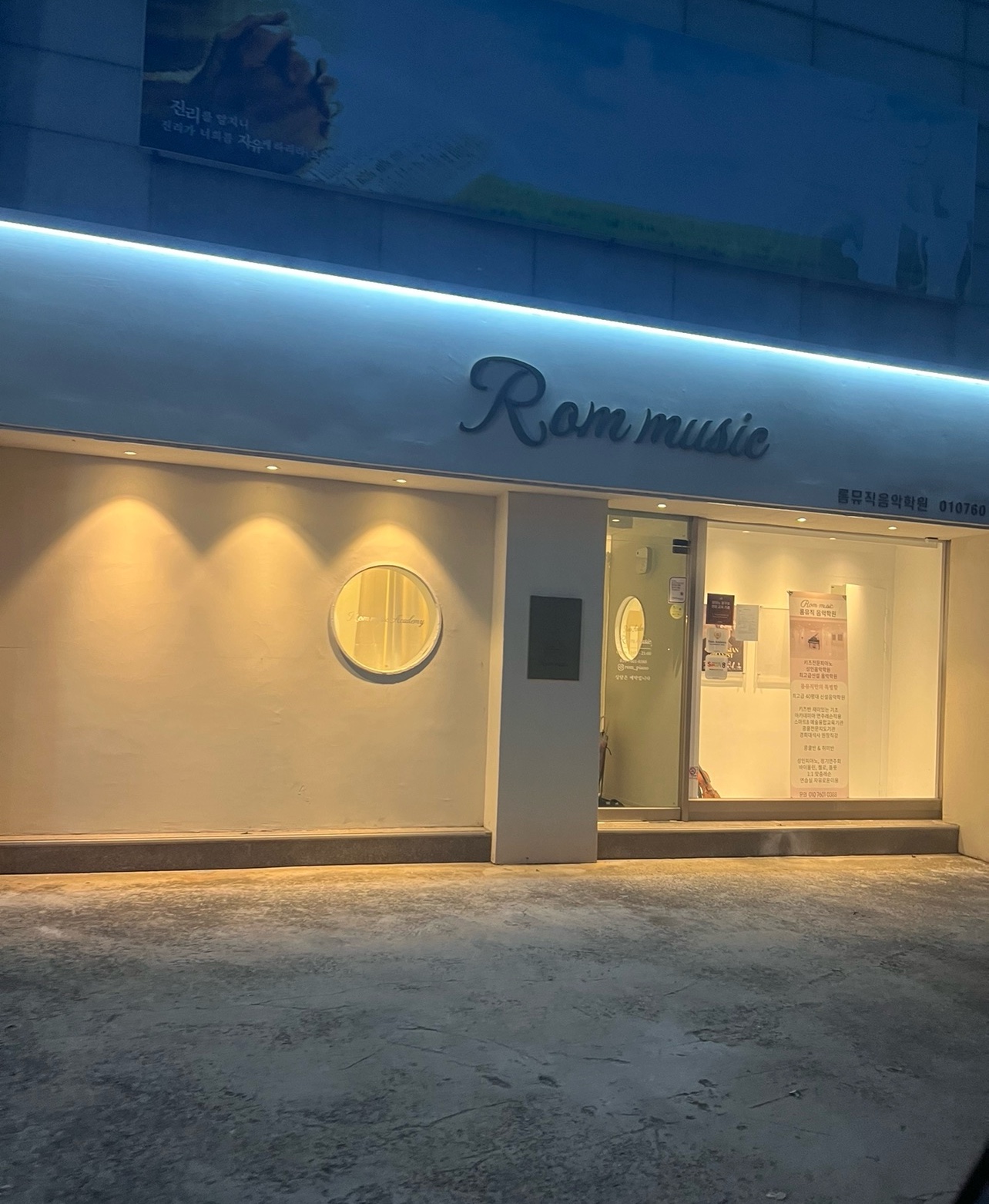 밝은 톤의 인테리어로 따듯한 조명을 이용해 어디서든 한눈에 띄는 롬뮤직의 외관입니다.